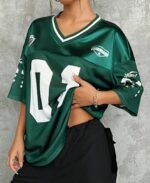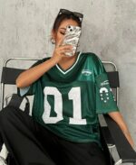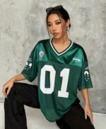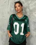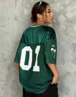 Luce el poder de un equipo ganador, incluso fuera del campo. Este jersey oversize en color verde esmeralda satinado está inspirado en el estilo del fútbol americano, perfecto para quienes aman el look urbano, relajado y deportivo. Su número «01» representa a quienes siempre van un paso adelante. 💯