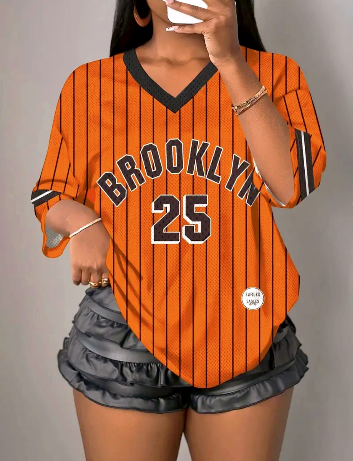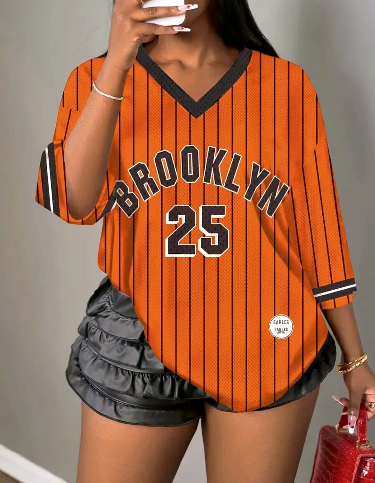 Eleva tu look deportivo con esta camiseta tipo jersey Brooklyn 25, diseñada para quienes aman el street style con esencia atlética. Su color naranja vibrante con líneas verticales negras aporta un toque retro inspirado en el basketball clásico, mientras que su corte oversize garantiza comodidad y flow en cada movimiento.