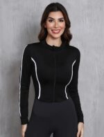 Diseñada para mujeres que buscan estilo, comodidad y rendimiento en una sola prenda. Esta chaqueta deportiva de corte ajustado realza tu figura sin perder la libertad de movimiento que necesitas. Su color negro clásico con líneas blancas laterales le da un toque moderno, elegante y versátil.