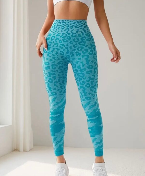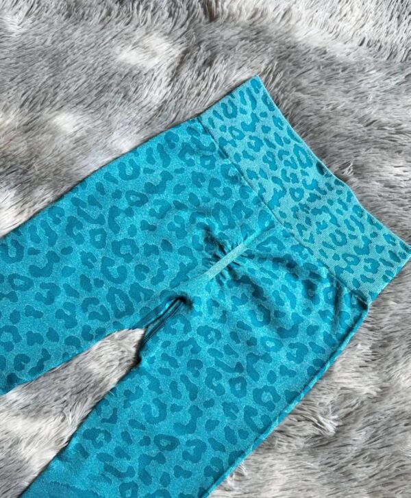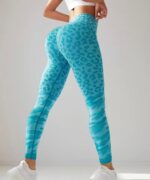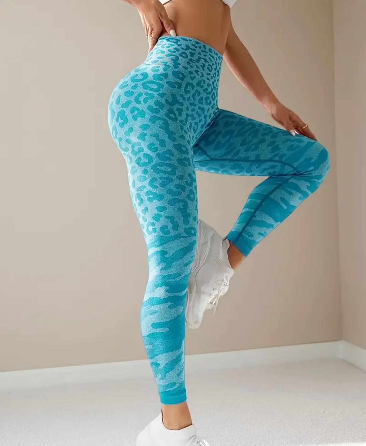 Eleva tu estilo deportivo con estos leggings de alto impacto visual y rendimiento superior. Su estampado animal print en tonos aqua no solo refleja tu energía salvaje, sino que también estiliza tu figura gracias a su diseño push-up con efecto moldeador.