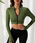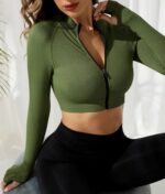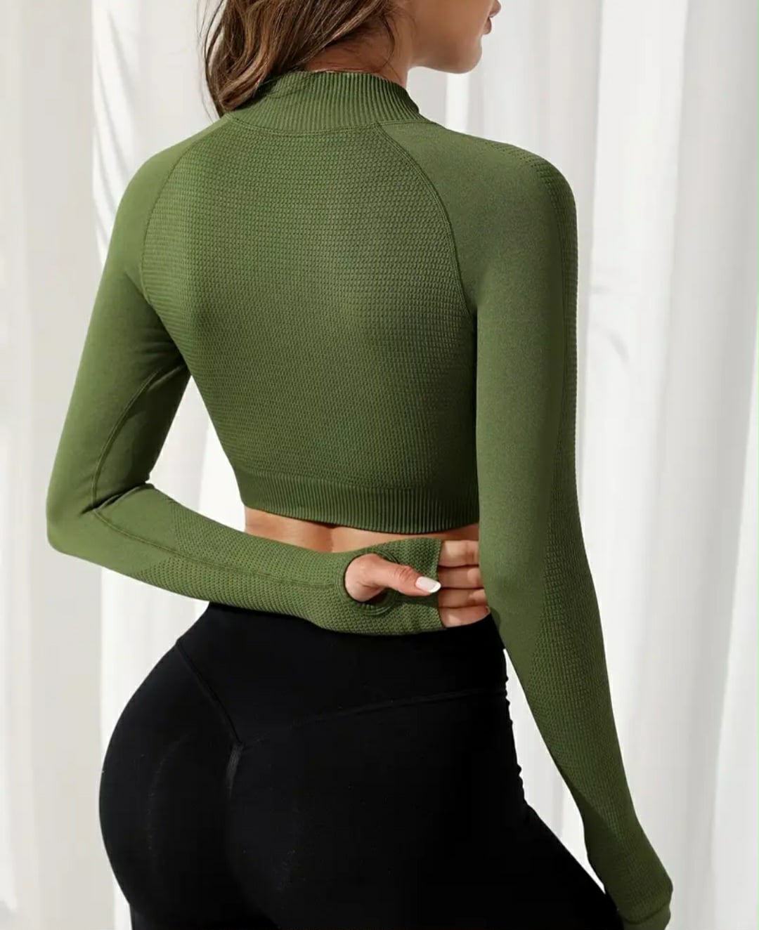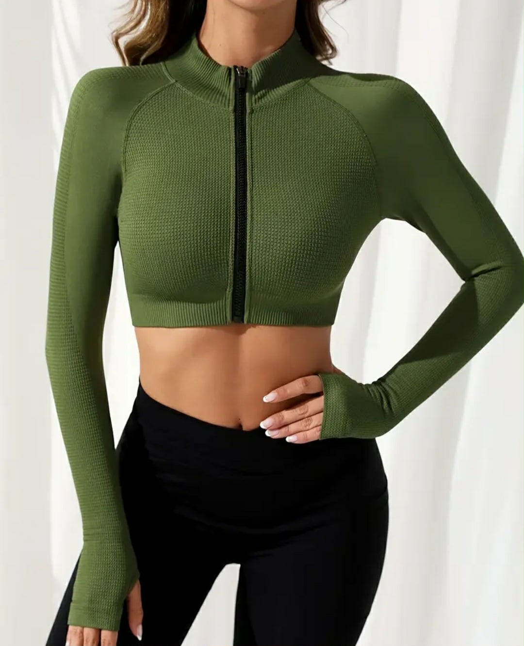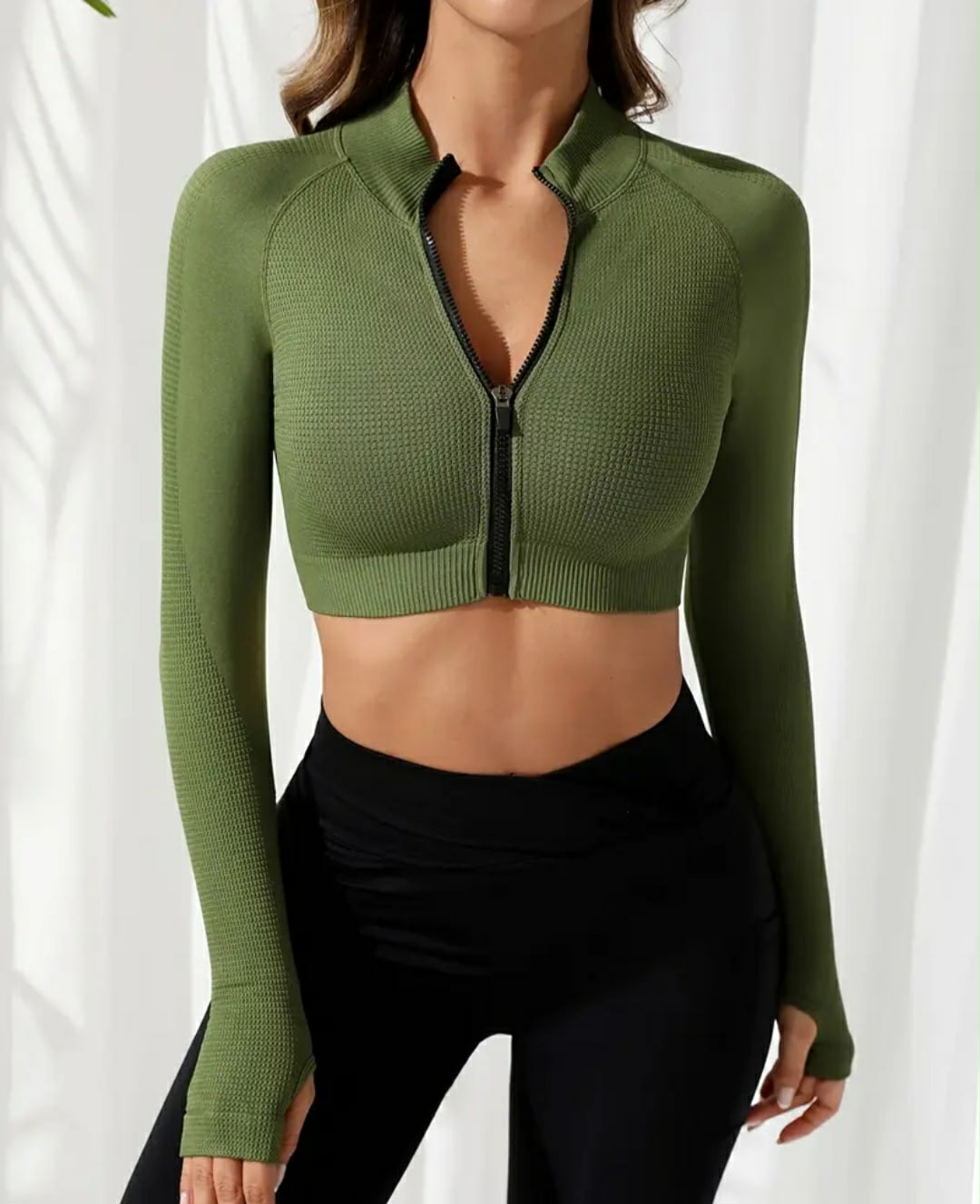 Eleva tu estilo fitness con esta chaqueta crop de manga larga, perfecta para entrenar o lucir un look sporty chic en tu día a día. Su diseño ajustado realza tu figura mientras te brinda comodidad y libertad de movimiento.